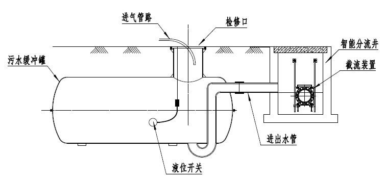 污水缓冲池分单舱污水缓冲池和一体化化粪缓冲池两种,其中单舱污水缓冲池设置在居民小区化粪池之后,一体化化粪缓冲池与化粪池作为一个整体。它们通过智能分流井与化粪池相连。晴天时小区污水经化粪池进入分流井后,直接进入下游的合流管内。中到大雨时,分流井内的截污管道关闭,小区的生活污水经化粪池后进入污水缓冲池进行缓冲池调蓄,避免了合流排口雨天的溢流污染,保证合流管道内仅进入污水。