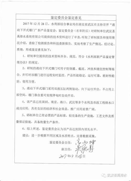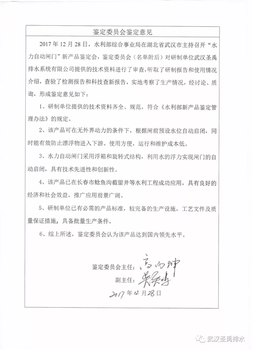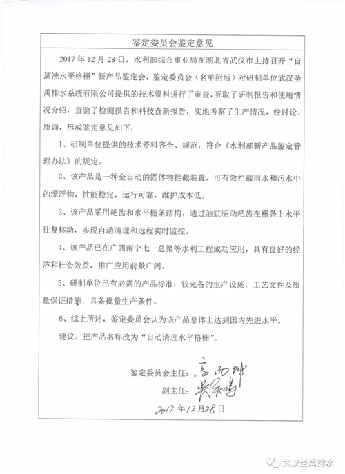此次鉴定会,武汉圣禹排水参与鉴定的新产品包括:水力自动闸门、液动下开式堰门、智能喷射器、自清洗水平格栅、一体化智能分流站及多功能组合调蓄池共六项新产品。经鉴定委员会一致认为,由武汉圣禹排水自主研发的六项新产品均达到国内领先水平,填补了国内水环境治理领域的多项空白。
