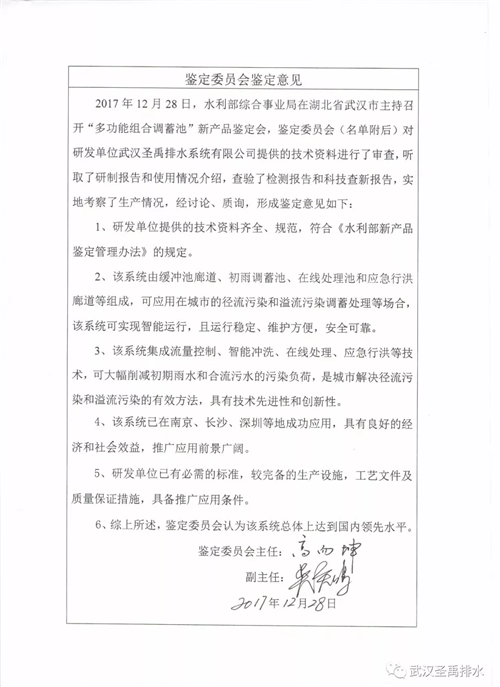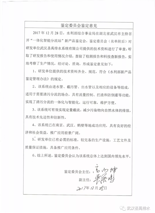 鉴定委员会一致同意并通过了武汉圣禹排水的六项新产品鉴定,并给予高度评价,认为该六项产品整体技术达到国内领先水平,填补了国内水环境治理领域的多项空白。