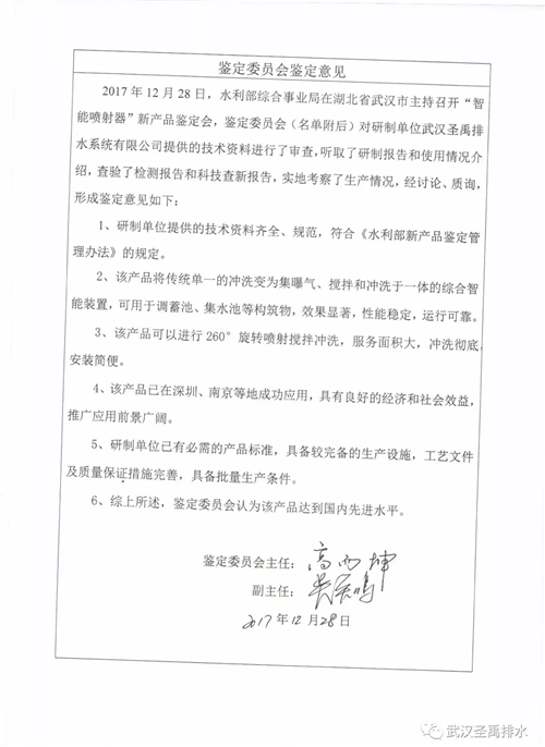 鉴定委员会听取了武汉圣禹排水研发中心研制人员的产品研制总结报告,查验了产品检测报告和科技查新报告等资料,并就相关问题进行了质询、答疑和讨论后形成了鉴定意见。