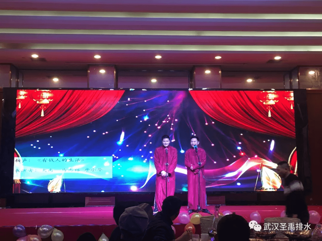 年会现场,圣禹和大禹人使尽浑身解数,在才艺比拼上各显身手,表演了一个又一个精彩的节目:舞蹈《一飞冲天》、街舞《Bring Back The Funk》、歌曲《玛依拉变奏曲》、小品《三句半》、音乐剧《非诚勿扰2》、歌曲《告白气球》、小品《抢红包》、小品《有钱人的生活》、舞蹈《水兵舞》、合唱《我的好兄弟》……劲歌热舞一个都不少,现场气氛嗨到极点,掌声不断,笑声连连。